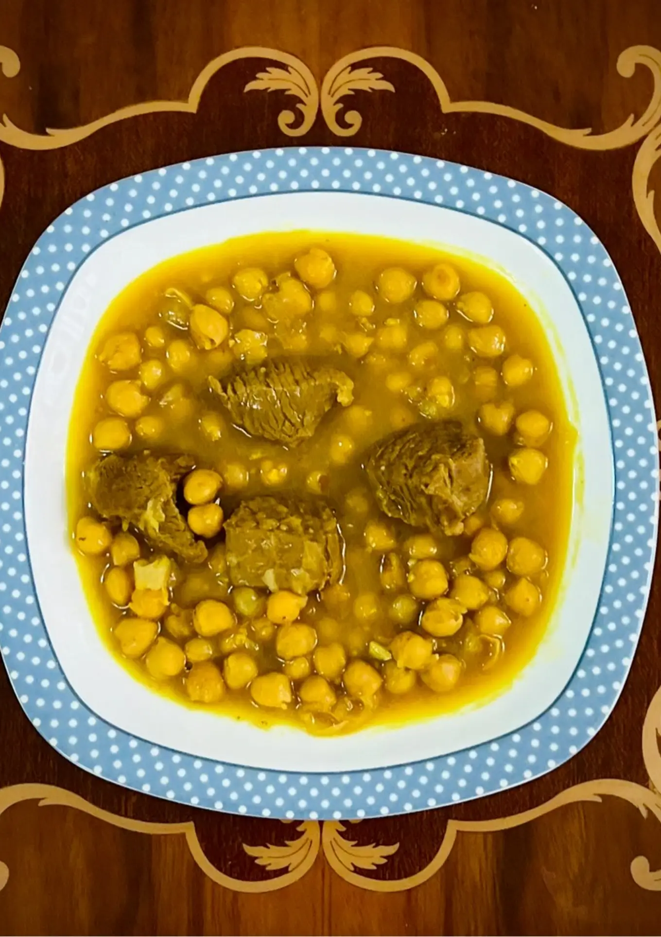 1 و نیم لیوان نخود پخته 8 تکه گوشت خورشتی 1 عدد پیاز 2 حبه سیر 1 و نیم لیوان آب جوش 1 ق چ ادویه (زردچوبه، پاپریکا نمک فلفل سیاه برگ بو و ادویه دلخواه)