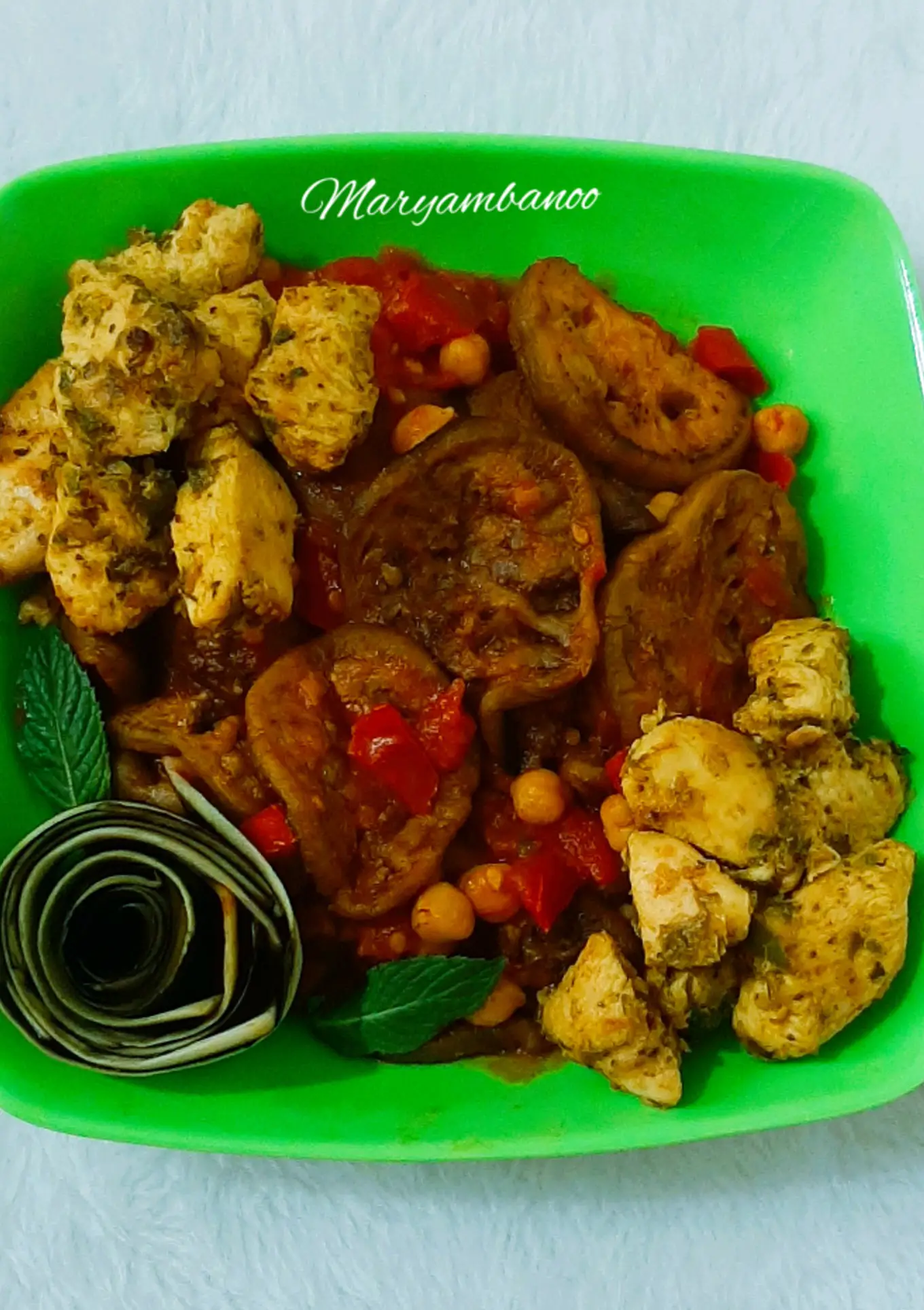 پیاز رو نگینی خرد کنید کمی تفت بدید سیر ها رو کمی ریز کنید و با پیاز تفت بدید. گوجه رو هم نگینی خرد کنید با رب به پیاز اضافه کنید و تفت کوچیک بدید. نمک و فلفل رو هم اضافه کنید. حالا نخود و بادمجون رو اضافه کنید و با تقریبا یکی دو لیوان آب جوش مدت ۱۵-۲۰ دقیقه رو حرارت کم بذارید که جا بیافته. نووش جاان