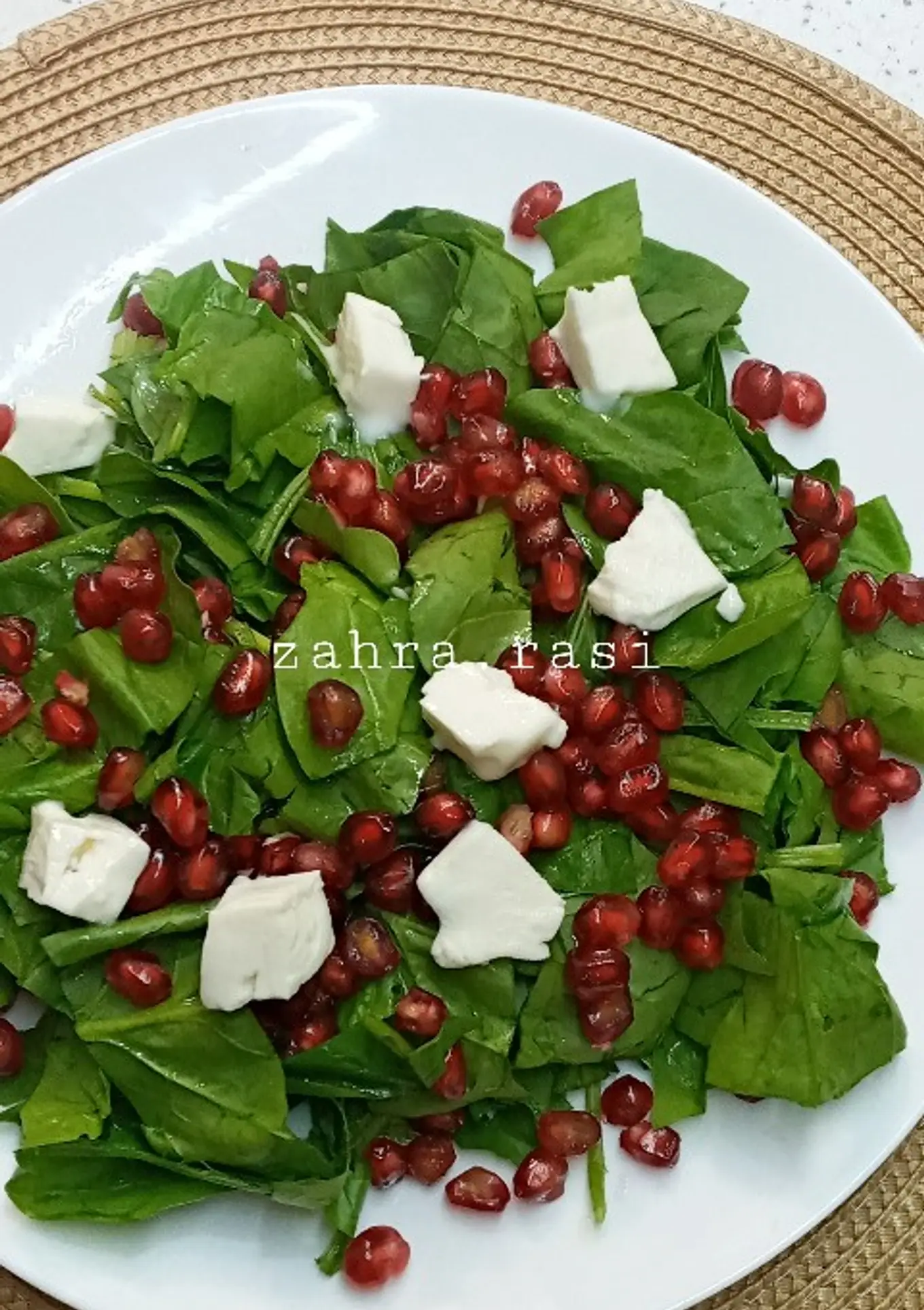 سفناج ها را خرد کرده و در بشقاب میریزیم بعد دانه های انار را روی آنها ریخته و پنیرهای تکه شده را میچینیم. نوش جان